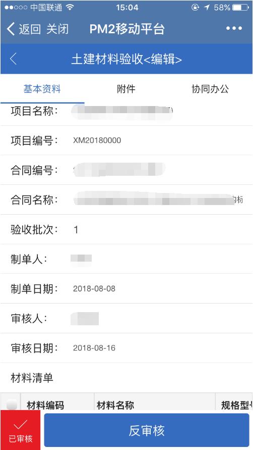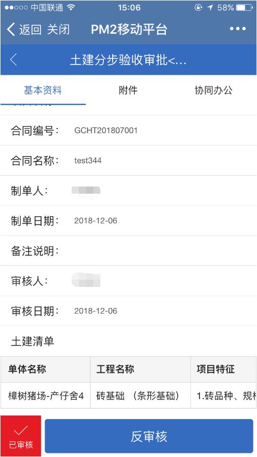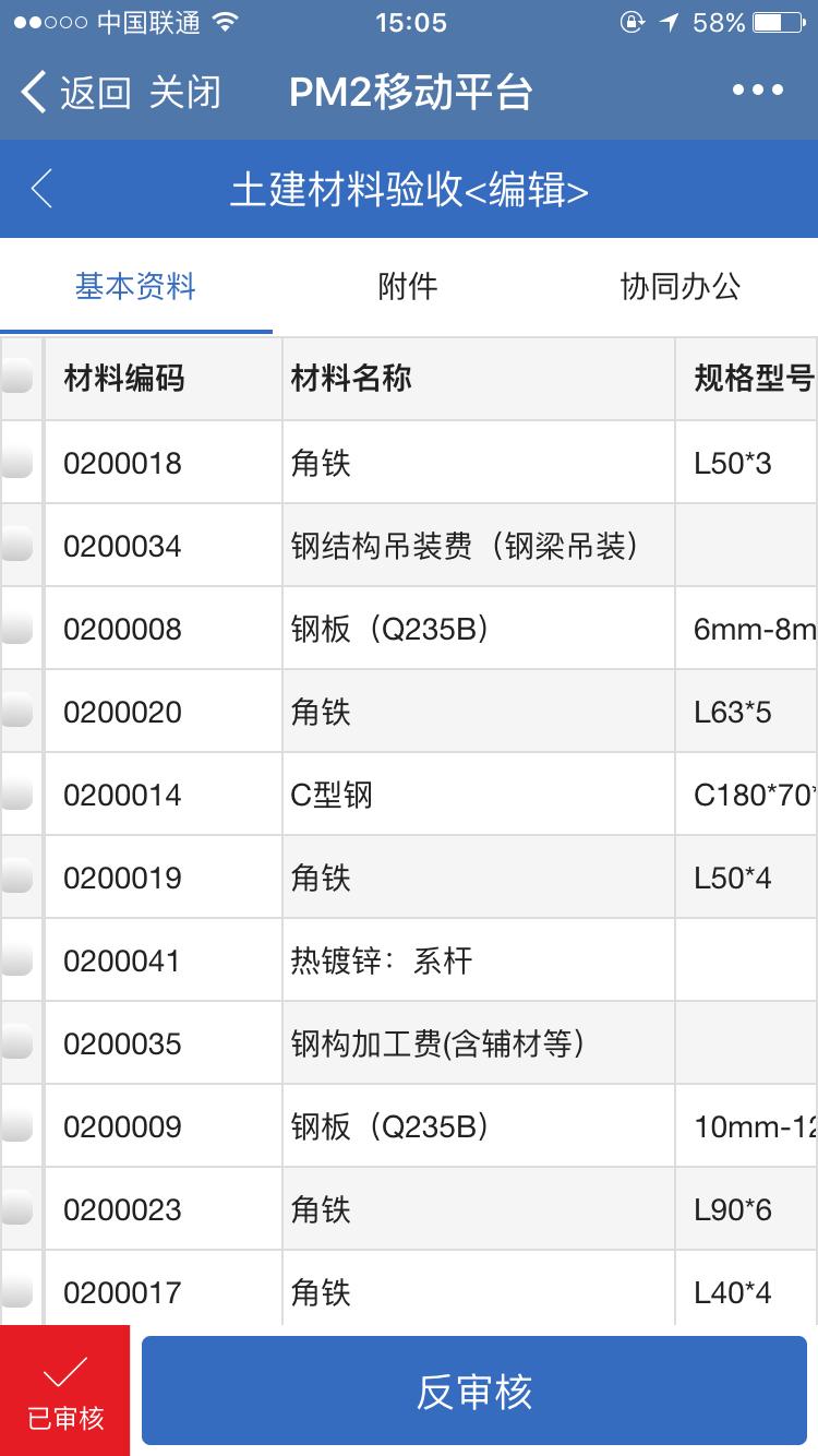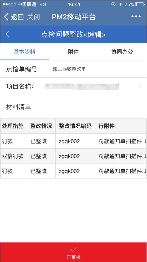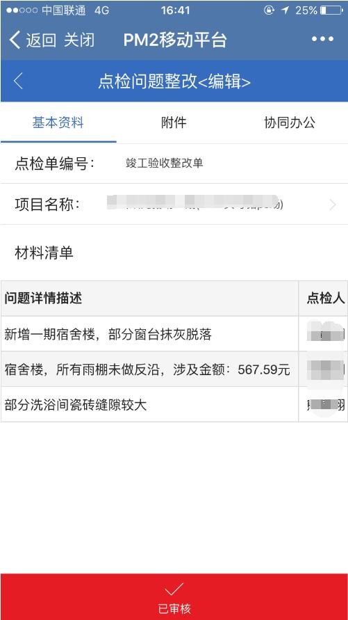定制手機(jī)端驗(yàn)收管理模塊,依據(jù)合同工程量清單,在施工現(xiàn)場對(duì)材料、設(shè)備和單體工程分別比照做質(zhì)量驗(yàn)收,并發(fā)起流程審批。