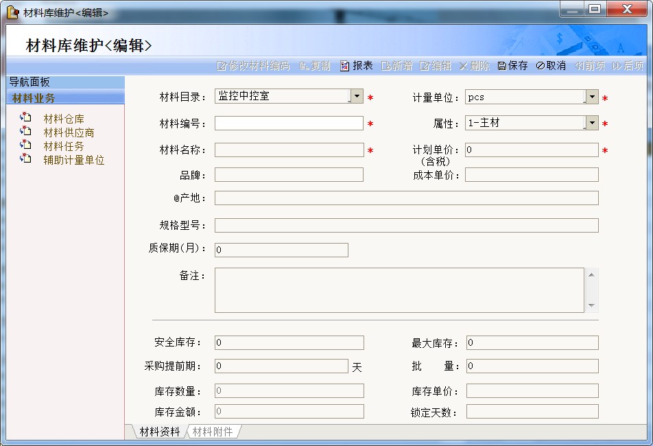 操作:打開【材料庫維護(hù)】界面,左側(cè)選擇材料目錄,單擊“新增”按鈕,系統(tǒng)彈出材料庫維護(hù)編輯界面,錄入材料編號(hào)、材料名稱、計(jì)量單位、屬性、計(jì)劃單價(jià)、規(guī)格、產(chǎn)地等信息后保存。