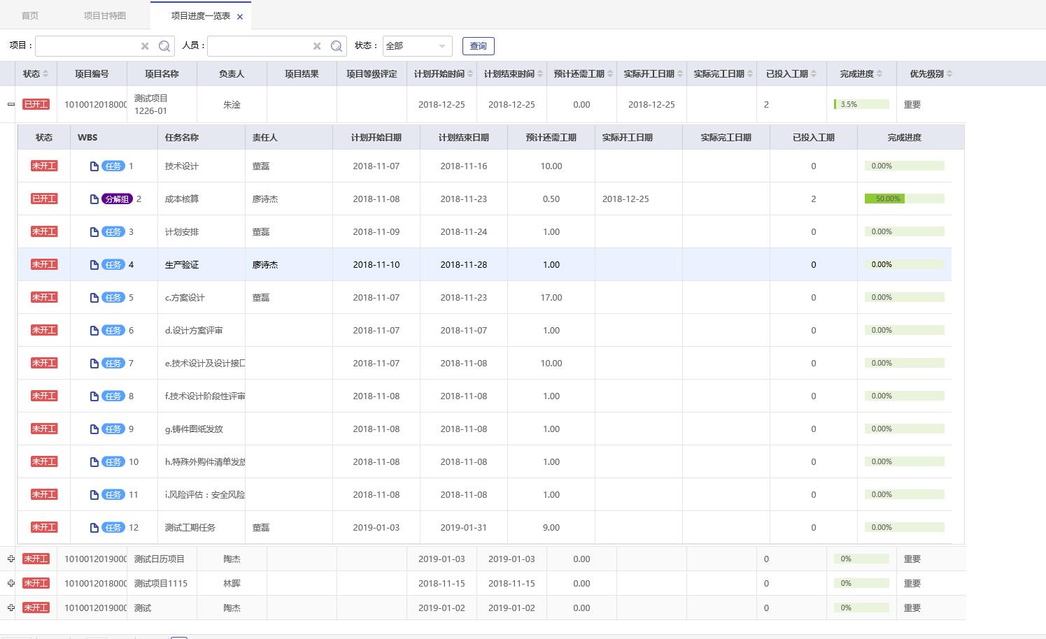 企業(yè)管理層需要了解一個(gè)項(xiàng)目從頭到尾所有的工作計(jì)劃完成時(shí)間,實(shí)際完成時(shí)間,完成進(jìn)度比,相關(guān)責(zé)任人,可以在系統(tǒng)中通過(guò)項(xiàng)目進(jìn)度一覽表來(lái)了解這些內(nèi)容,在這張報(bào)表中,可以通過(guò)對(duì)項(xiàng)目、責(zé)任人以及項(xiàng)目目前的狀態(tài)進(jìn)行篩選查看,每條計(jì)劃的進(jìn)展情況都一目了然。