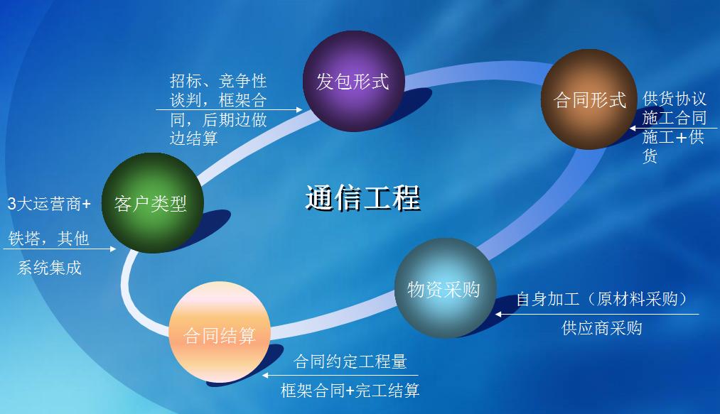 通信工程:從運營商派單、訂立框架合同,到派工施工隊,按站點施工,向運營商收款,給施工隊結(jié)算付款全過程的管理。