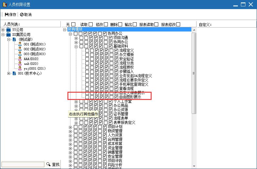當設(shè)計好自由報表并且保存生效發(fā)布后,通過模塊授權(quán),對該菜單進行授權(quán),授權(quán)后,用戶才可見該模塊。