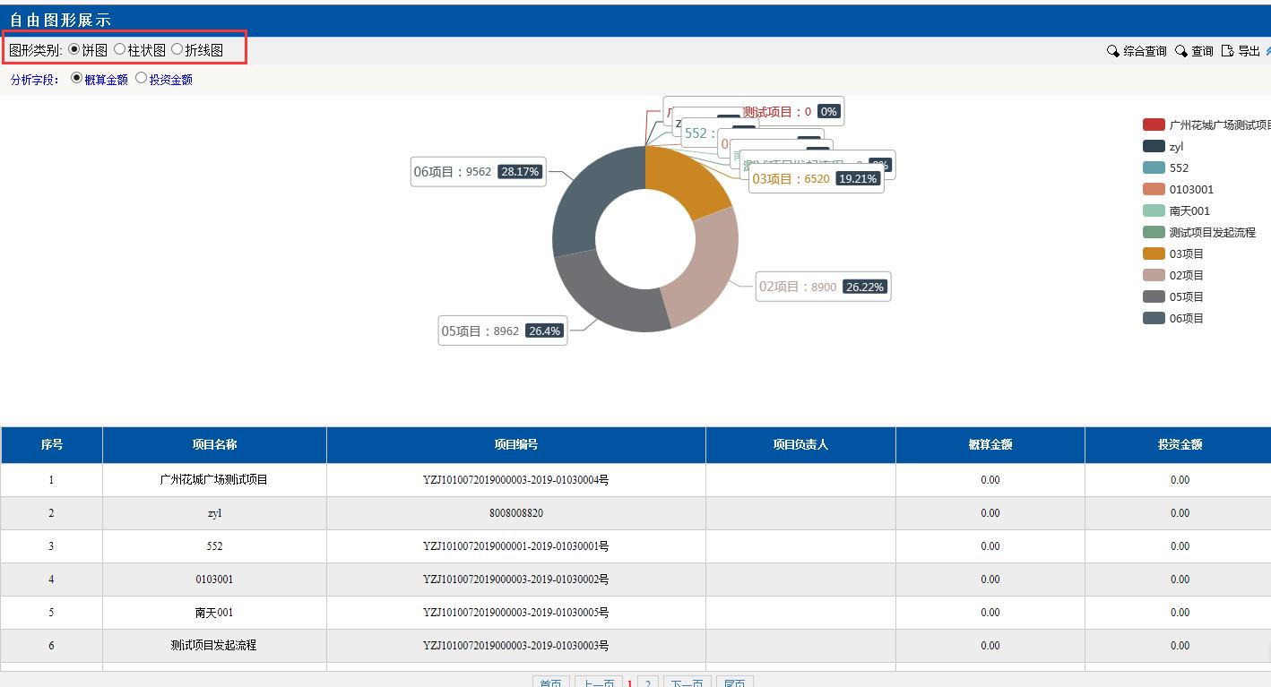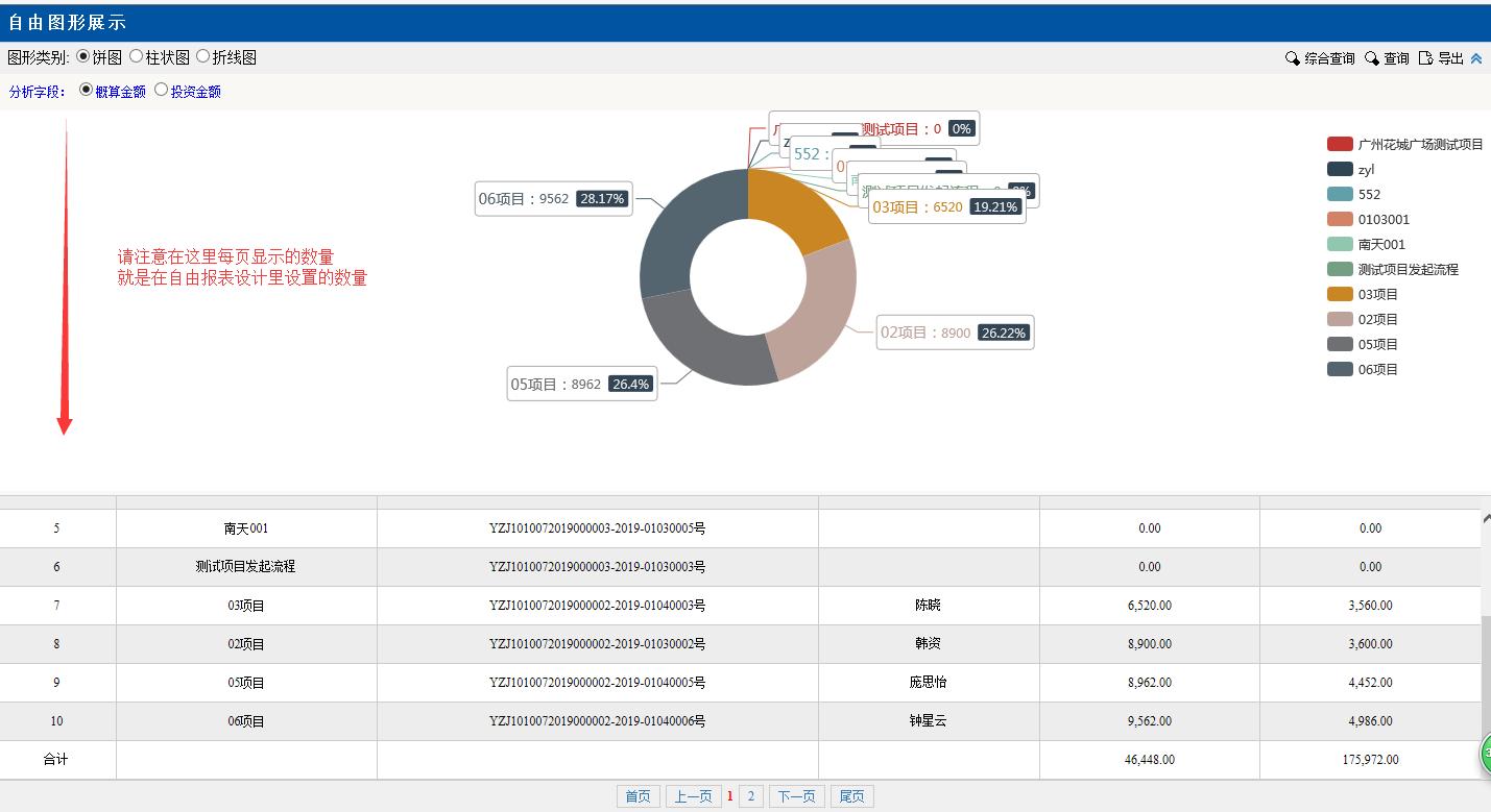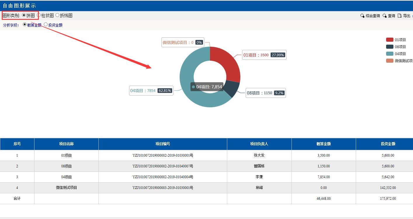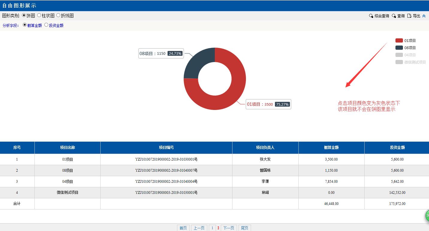圖形類別點擊:餅圖。餅圖里的分項目,金額等對應(yīng)下面分頁的數(shù)據(jù),匯總分析占總金額的百分比,點擊項目前面的顏色按鈕變?yōu)榛疑珷顟B(tài),該項目就不會在左邊餅圖里顯示了。