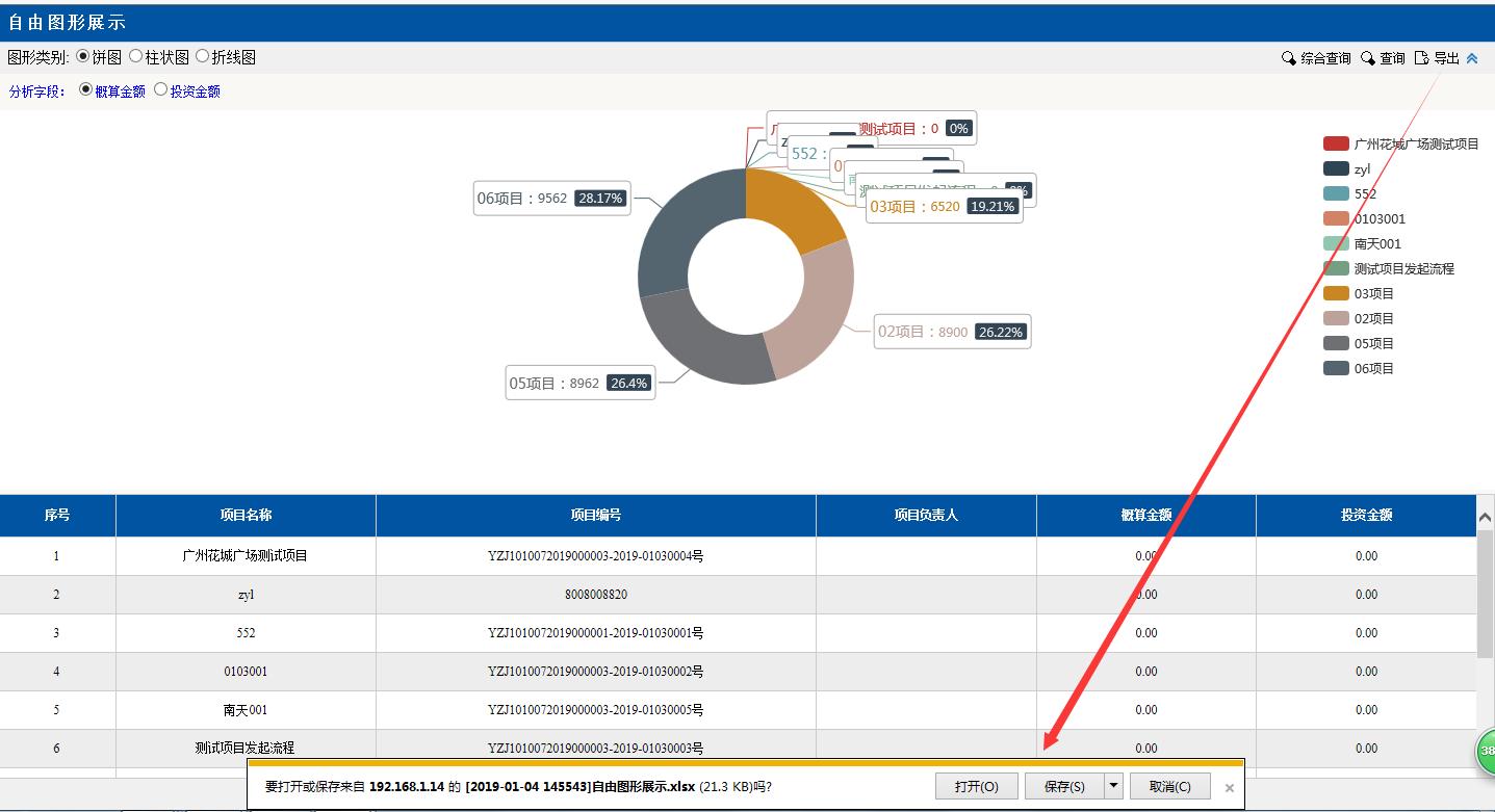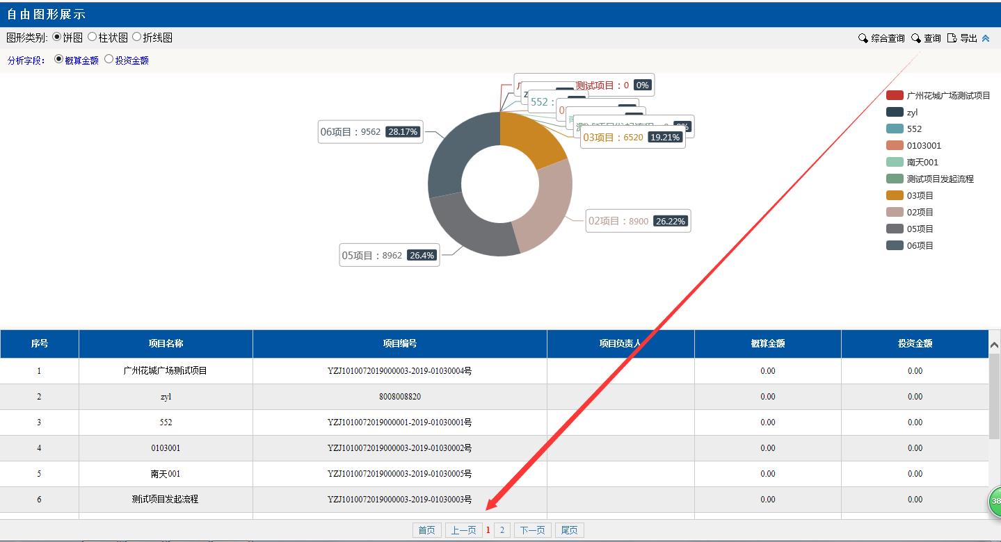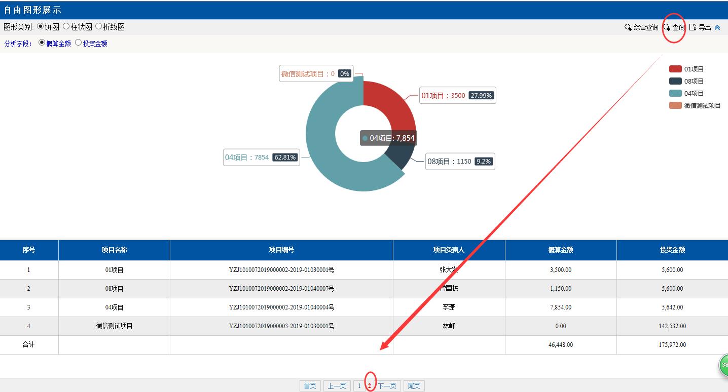 圖形類別點擊:餅圖。餅圖里的分項目,金額等對應(yīng)下面分頁的數(shù)據(jù),匯總分析占總金額的百分比,點擊項目前面的顏色按鈕變?yōu)榛疑珷顟B(tài),該項目就不會在左邊餅圖里顯示了。