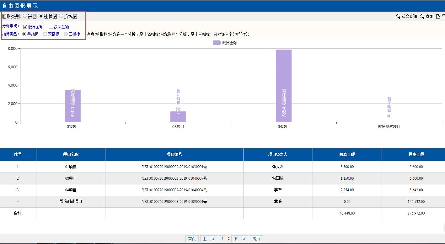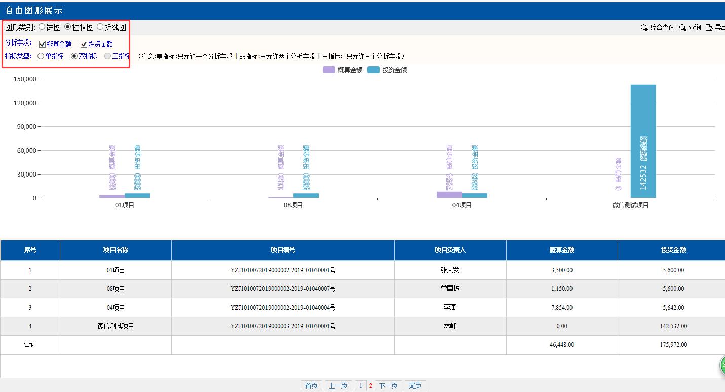 圖形類別點擊:柱狀圖。柱狀圖里的項目,金額等對應(yīng)下面分頁的數(shù)據(jù),可以很直觀的看出每個項目金額多少。也可做字段間的對比,最多支持分析3個字段,具體要分析哪個字段的時候,要注意在該字段前勾選分析字段和指標類型。