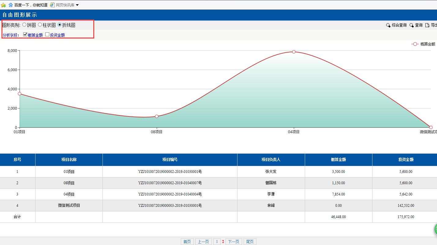 圖形類別點擊:折線圖。折線圖里的項目,金額等對應(yīng)下面分頁的數(shù)據(jù),可以很容易顯示每個項目金額的差額變化
