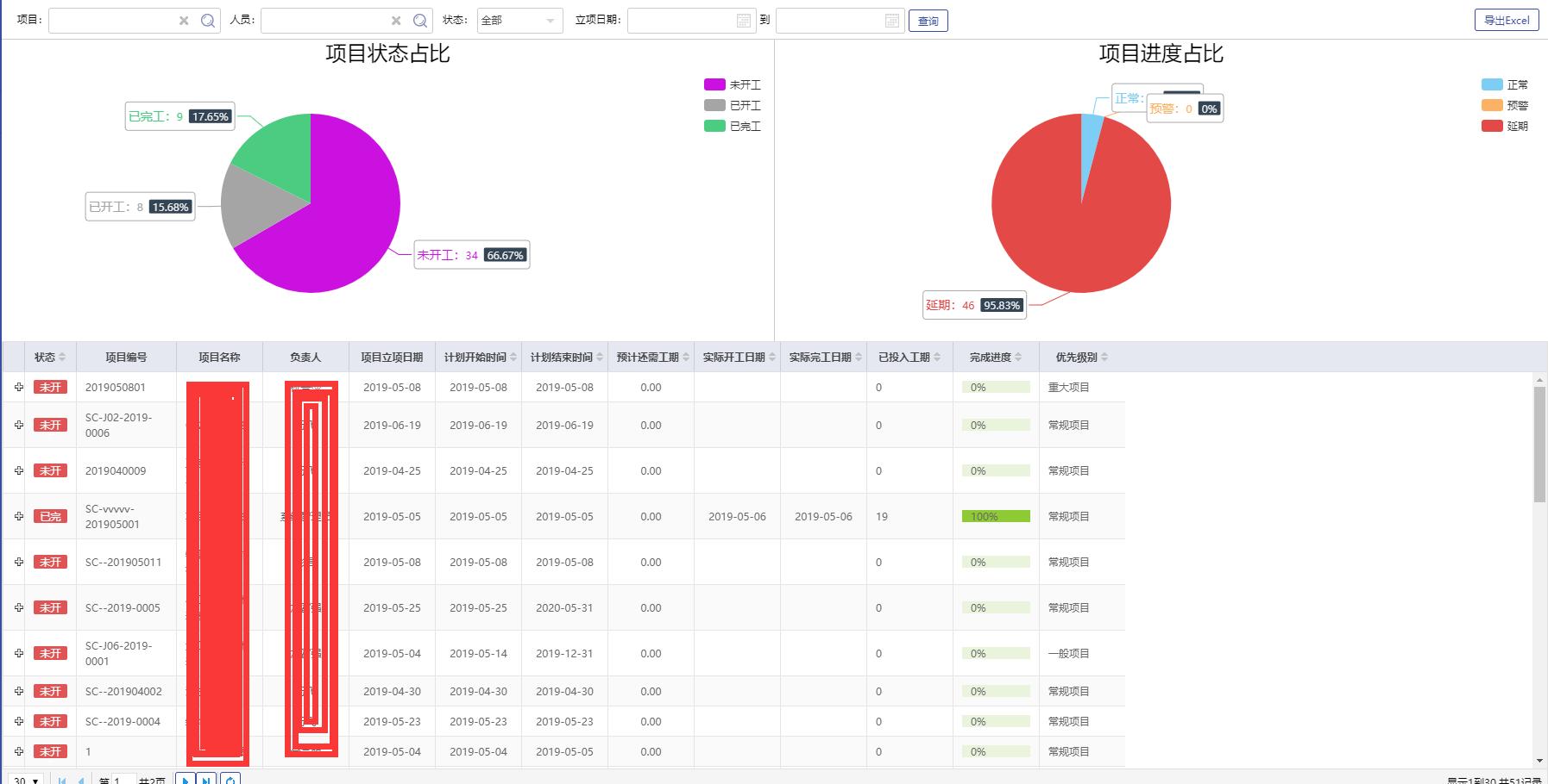 總覽項(xiàng)目,查看未開工、已開工、已完工項(xiàng)目占比,及各比例中項(xiàng)目的進(jìn)度狀態(tài),并提供數(shù)據(jù)明細(xì)列表查閱相關(guān)詳細(xì)信息。