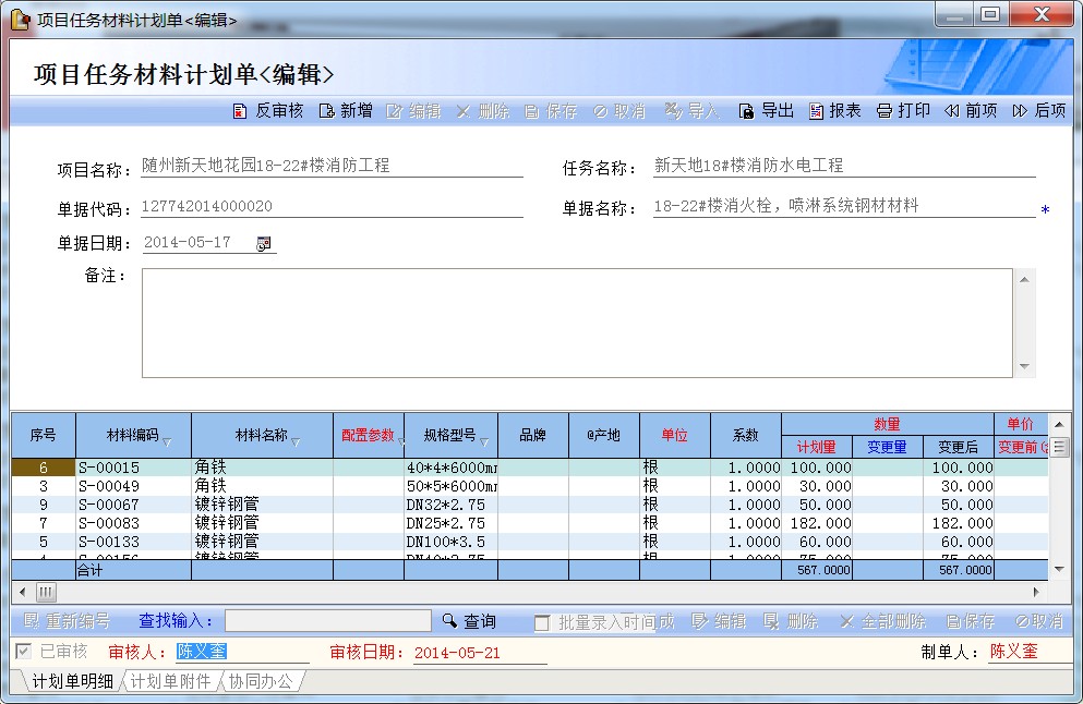 (3)所有項(xiàng)目的材料申請(qǐng)必須通過材料計(jì)劃、項(xiàng)目任務(wù)計(jì)劃、采購申請(qǐng)單一步一步完成。對(duì)項(xiàng)目材料的申請(qǐng)、購買實(shí)現(xiàn)全程把控,以下截圖以“隨州光谷鑫城”為例。