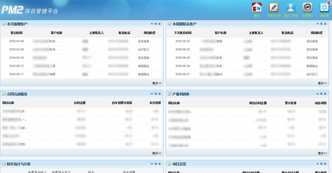 3. 系統(tǒng)首頁展示(PM2項目管理系統(tǒng)首頁顯示的模塊可自定義,柯瑞工程高層注重客戶發(fā)展與維系,因此系統(tǒng)管理員專門為其定義了相關(guān)的客戶信息在首頁顯示,及時看到客戶的相關(guān)信息。)